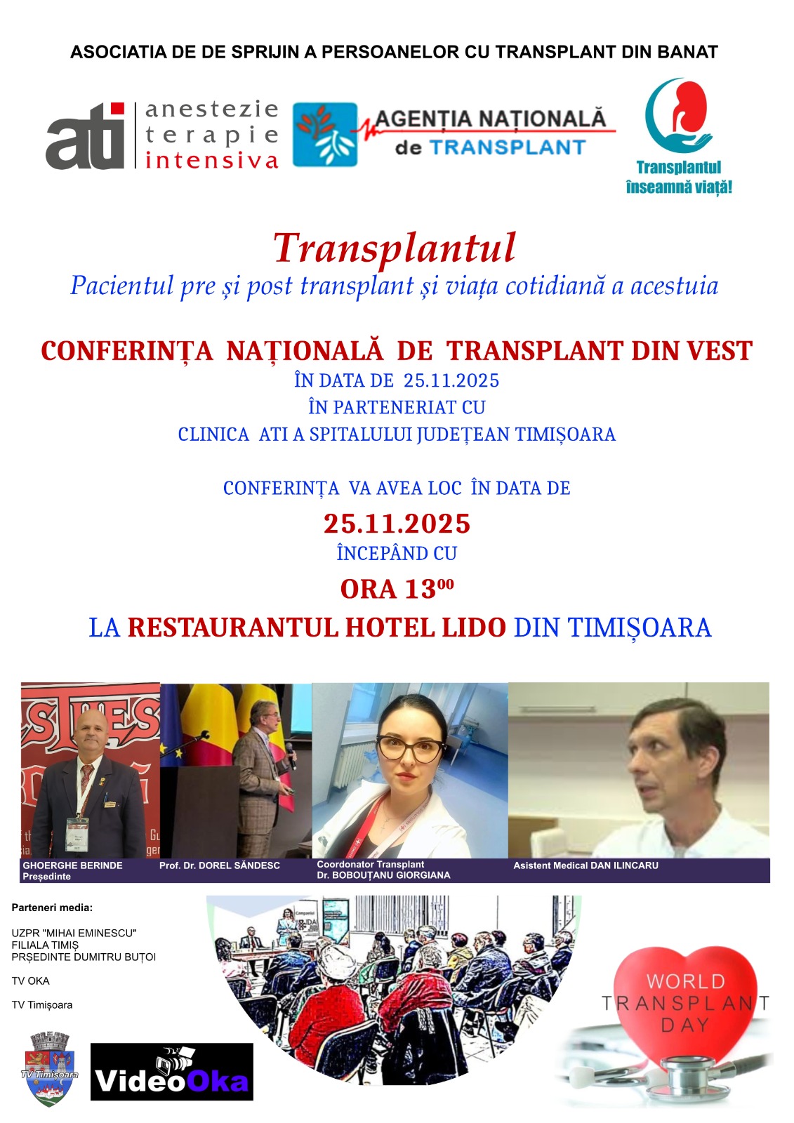 În acest contex, Asociația de Sprijin a Persoanelor cu Transplant din Banat, președinte Gheorghe Berinde, în parteneriat cu Clinica ATI a Spitalului Județean „Pius Brânzeu” din Timișoara, organizează, în data de 25 noiembrie 2025, la pensiunea ,,Lido” din Timișoara, începând cu ora 13,00, Conferința Națională de Transplant din Vest.