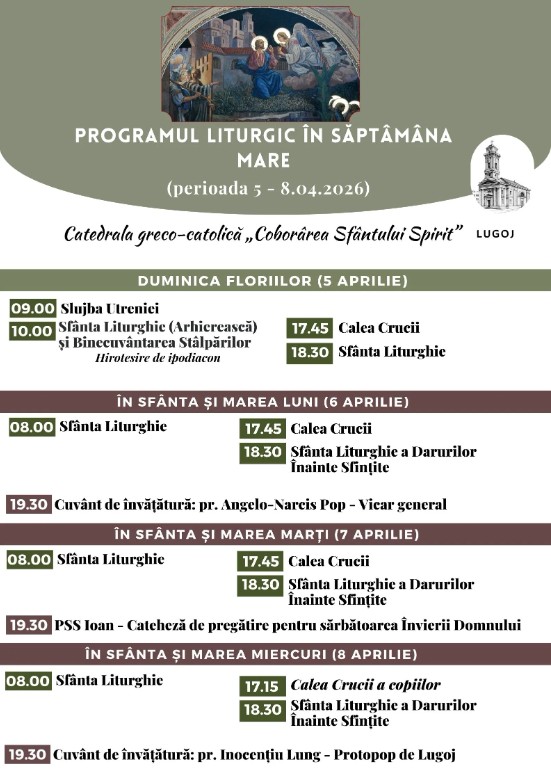 Credincioșii greco-catolici din municipiu se pregătesc pentru cea mai importantă sărbătoare a creștinătății. Catedrala „Coborârea Sfântului Spirit” a făcut public programul liturgic complet pentru Săptămâna Mare și Sfintele Paști 2026, perioadă marcată de slujbe arhierești, momente de cateheză și tradiționala rânduială a spălării picioarelor.
