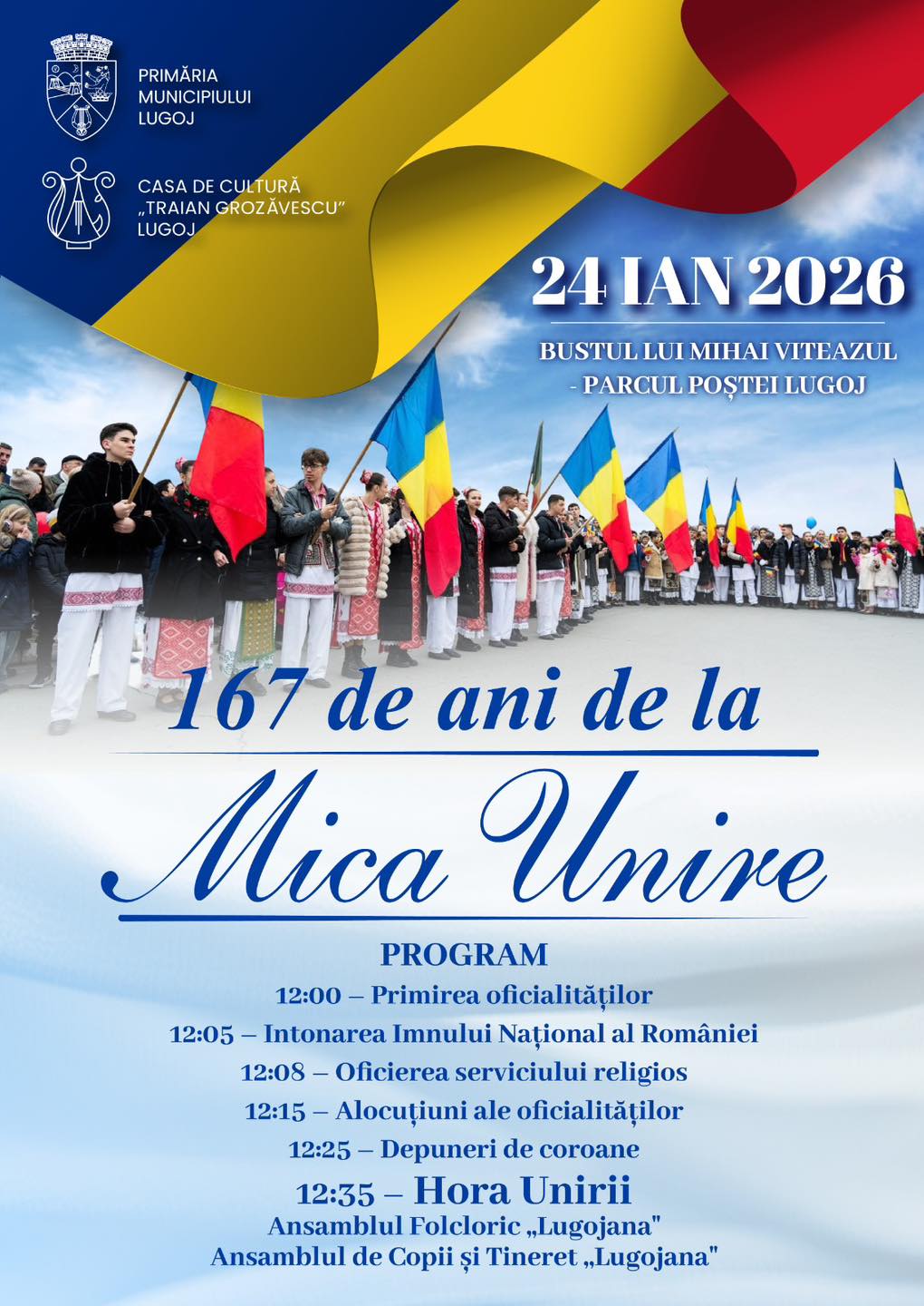 Municipiul Lugoj va marca sâmbătă, 24 ianuarie 2026, împlinirea a 167 de ani de la Mica Unire, printr-o manifestare publică organizată la bustul lui Mihai Viteazul, în Parcul Poștei.