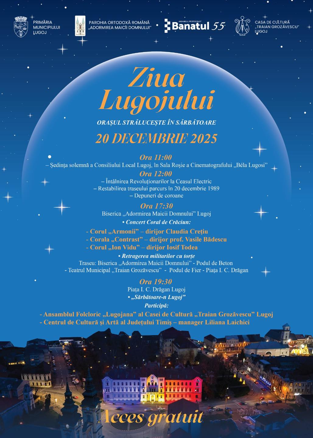 Municipiul Lugoj va marca Ziua Lugojului sâmbătă, 20 decembrie 2025, printr-o serie de manifestări dedicate comunității, organizate de Primăria Municipiului Lugoj, Parohia Ortodoxă Română „Adormirea Maicii Domnului”, Ansamblul Profesionist Banatul 55 și Casa de Cultură „Traian Grozăvescu” Lugoj. Evenimentele se vor desfășura pe parcursul întregii zile, în mai multe locații din oraș, iar accesul este gratuit.