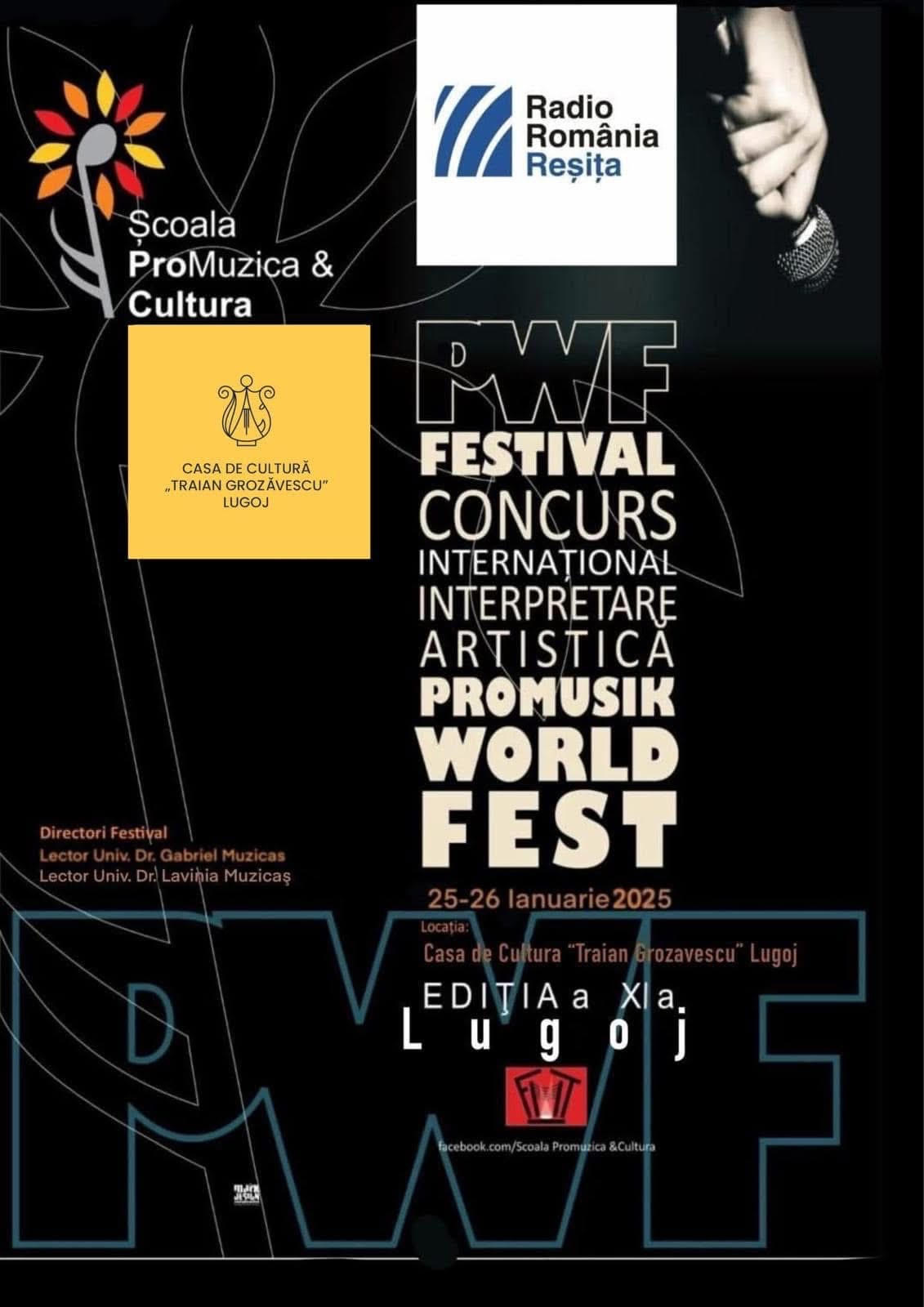 În perioada 25-26 ianuarie 2025, Teatrul Municipal „Traian Grozăvescu” din Lugoj va găzdui un eveniment cultural deosebit, destinat tuturor celor pasionați de muzică, dans, teatru și arte interpretative: Concursul Internațional de Interpretare „ProMusik World Fest”, un eveniment organizat de Școala ProMusica & Cultură, sub îndrumarea profesorilor Lector Univ. Dr. Gabriel Muzicaș și Lector Univ. Dr. Lavinia Muzicaș, în parteneriat cu Casa de Cultură „Traian Grozăvescu” din Lugoj.
