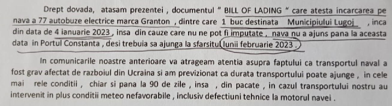 Conform răspunsului transmis de către societatea SC BMC TRUCK & BUS SA, cea care trebuie să livreze autobuzele, întârzierile ar fi cauzate de războiul din Ucraina, care a perturbat transportul naval, iar nava pe care sunt încărcate autobuzele, nu a putut pleca spre România. Reprezentanții societății susțin că 77 de autobuze, din care unul pentru Lugoj, sunt deja încărcate și așteaptă permisiunea să plece spre România „încă din data de 4 ianuarie”.