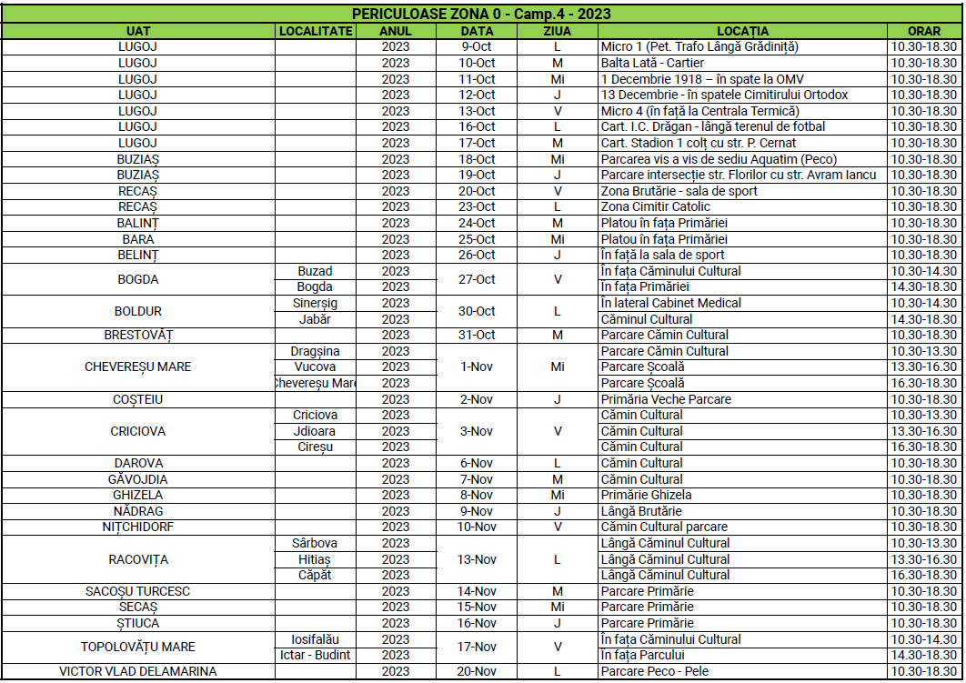 Cetățenii din localităţile menţionate mai sus pot depune prin aport voluntar și gratuit deșeurile periculoase din menajer în containerele special puse la dispoziție în punctele de colectare și între orele menționate în tabelul de mai jos.