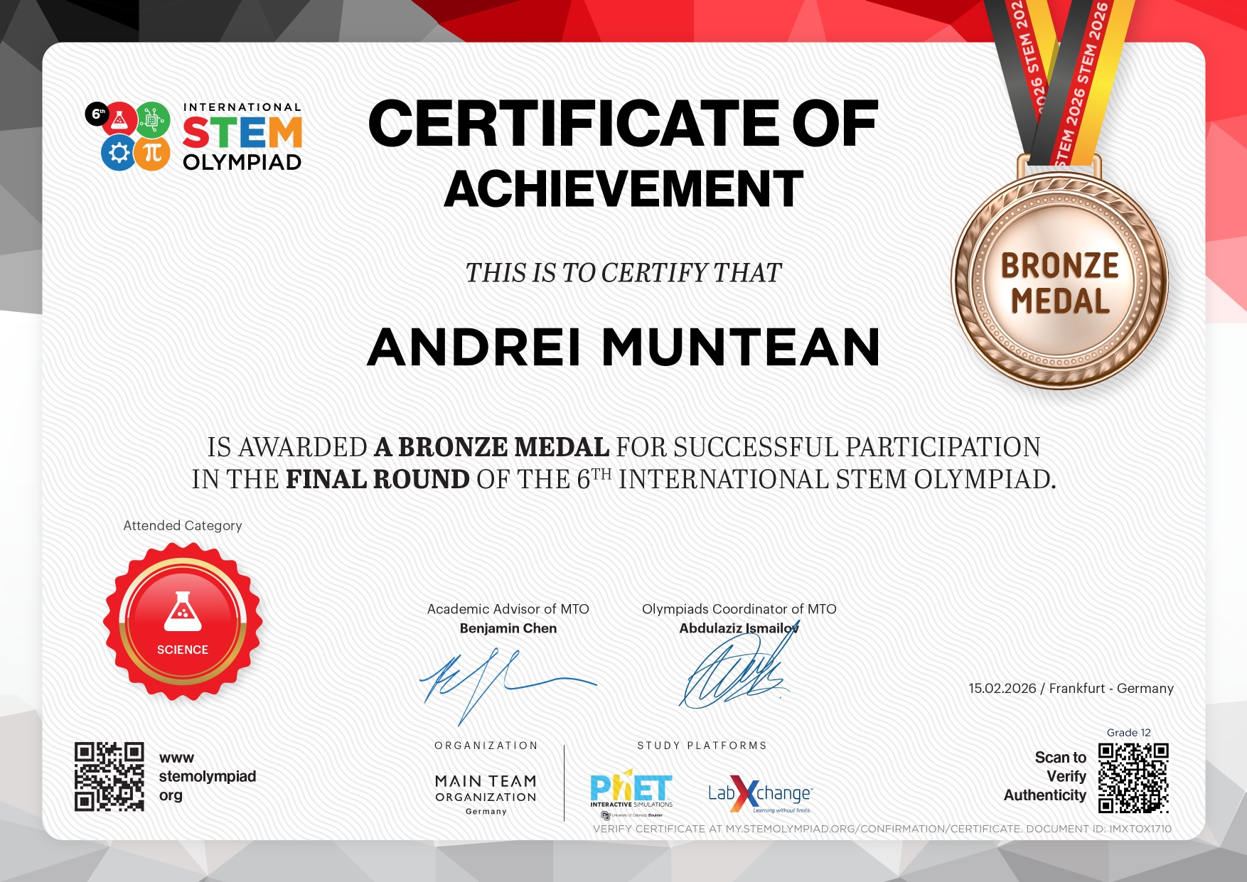 Performanță remarcabilă pentru un elev din Lugoj. Andrei Muntean, elev în clasa a XII-a B la Liceul Teoretic „Coriolan Brediceanu”, a obținut două medalii de bronz la runda finală a International STEM Olympiad 2026, la categoriile Științe și Matematică.