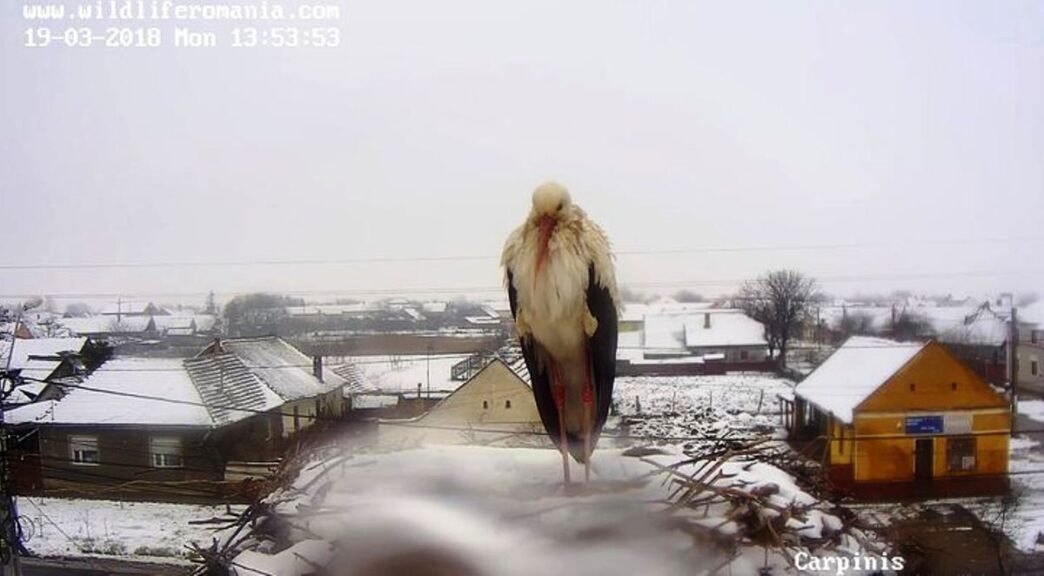 Din păcate, bucuria revenirii nu e prea mare, deoarce luni, 19 martie, cuibul berzelor a fost acoperit de zăpada. În imaginile transmise live aici se poate vedea barza botezată Cris, de cei de la Wildlife România, care îndură vremea rea şi frigul de afară.