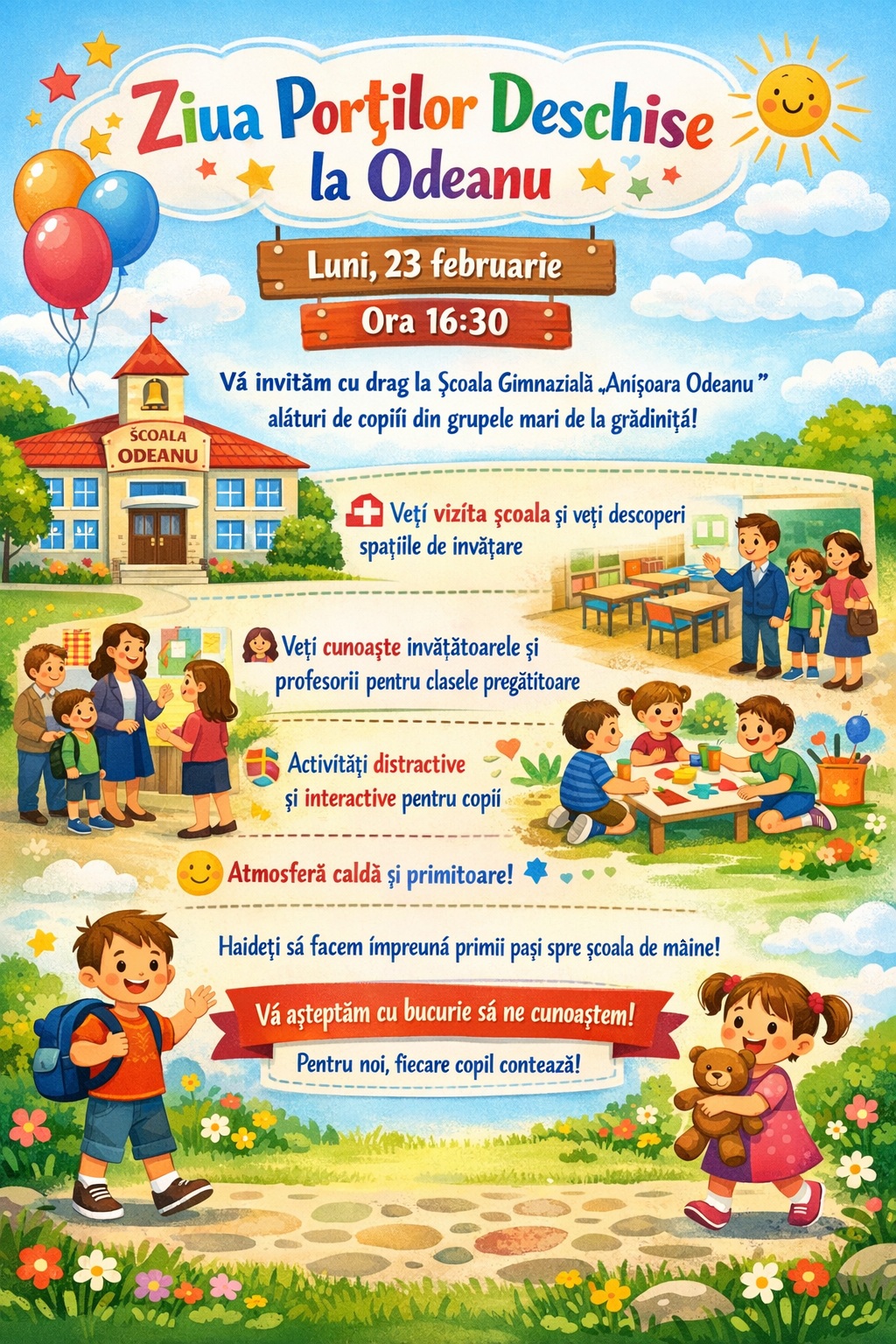 Școala Gimnazială „Anișoara Odeanu” din Lugoj organizează „Ziua Porților Deschise”, un eveniment dedicat părinților copiilor din grupele mari de la grădiniță, care sunt invitați să participe alături de cei mici.