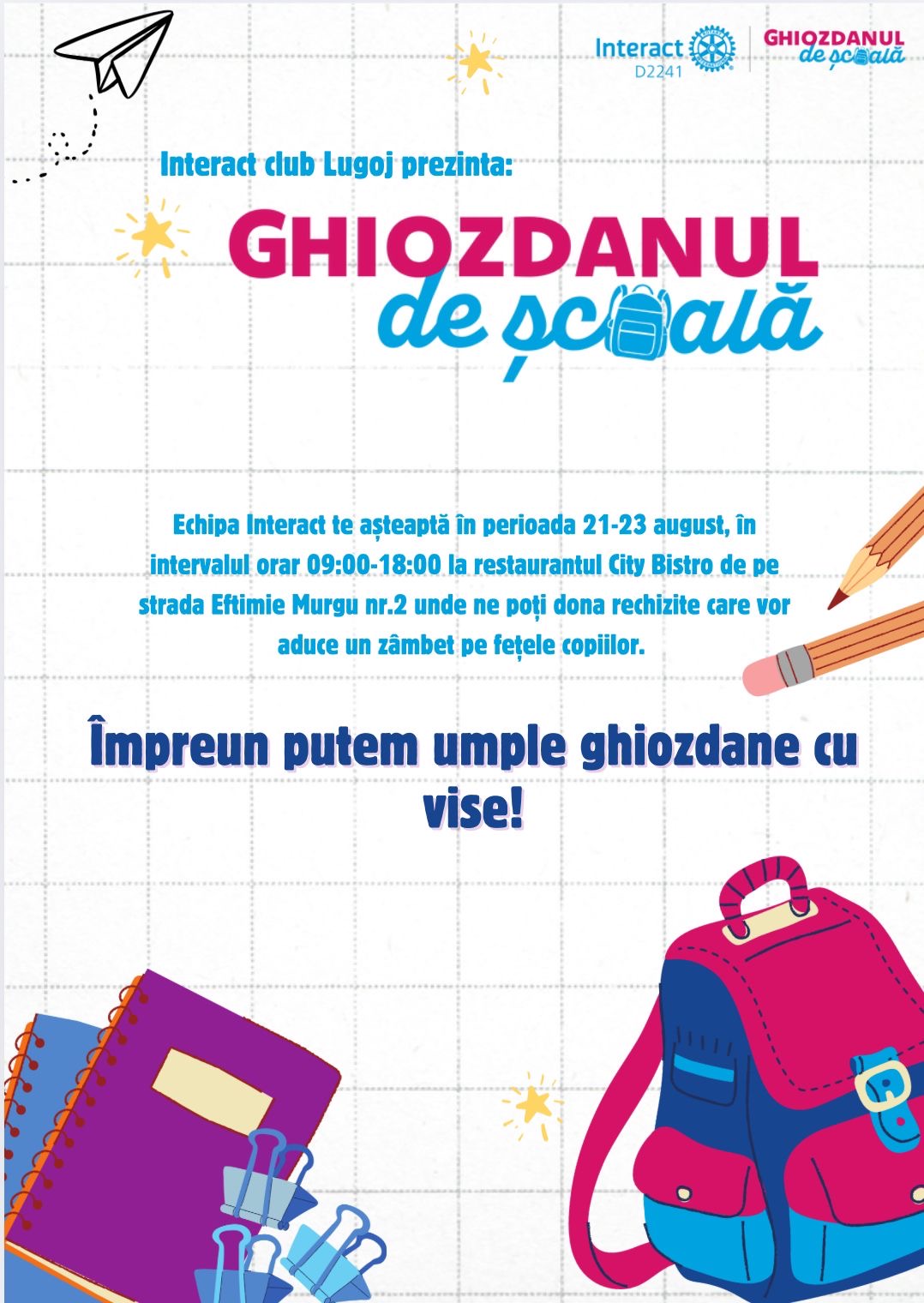 Proiectul „Ghiozdanul de școală”, organizat de Interact Club Lugoj, are ca scop sprijinirea copiilor din medii defavorizate prin oferirea de ghiozdane echipate cu toate rechizitele necesare pentru începutul anului școlar.