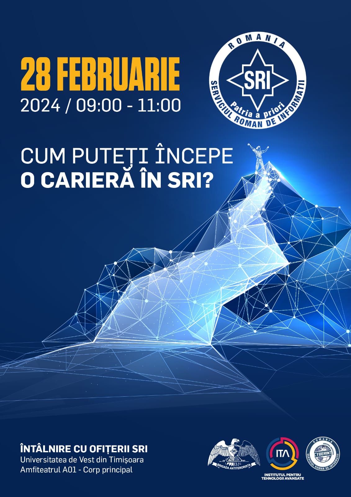 Ofițerii Serviciului Român de Informații (SRI) îi așteaptă pe cei care își doresc o carieră în cadrul serviciului la trei întâlniri, două la Timișoara și una la Arad. Miercuri, 28 februarie, între orele 9 și 11, în amfiteatrul A01, la parterul UVT; miercuri, 28 februarie, de la 13 la 15, la Universitatea Politehnică Timișoara, la Centrul de Conferințe, Sala K1 și joi, 29 februarie, între orele 10 și 12, în Sala Roșie, Complex M, Centrul de Conferințe.