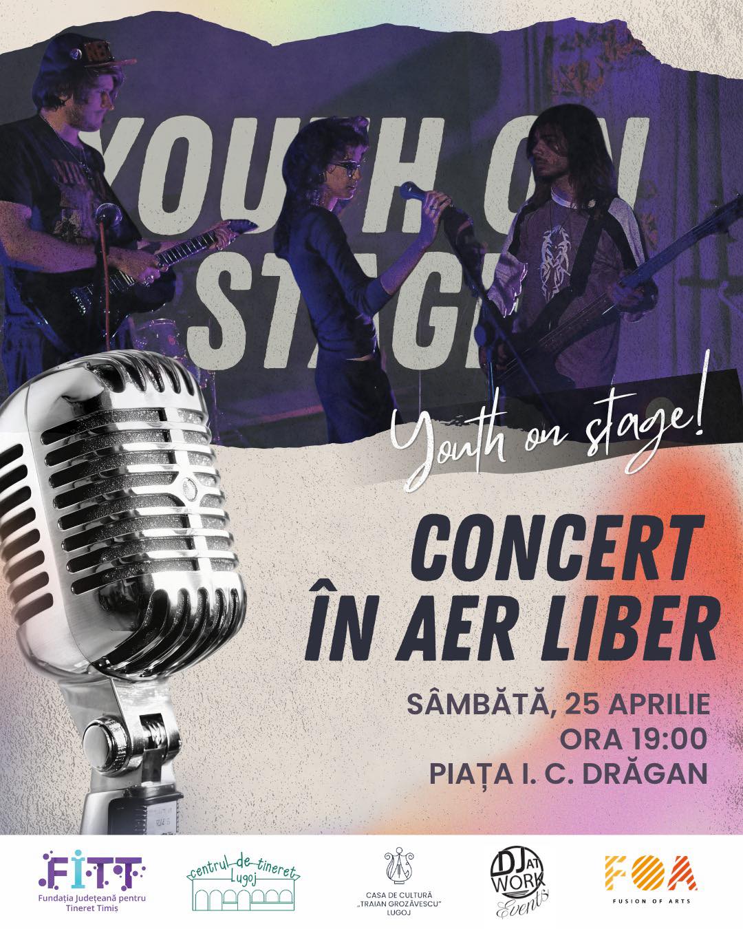 Centrul de Tineret Lugoj lansează o invitație deschisă adolescenților și tinerilor din oraș: evenimentul „Youth on Stage”. Sâmbătă, 25 aprilie, începând cu ora 19:00, platoul din Piața I.C. Drăgan se va transforma într-o scenă deschisă pentru oricine dorește să își exprime talentul artistic, fie că este vorba despre muzică, teatru sau alte forme de interpretare.