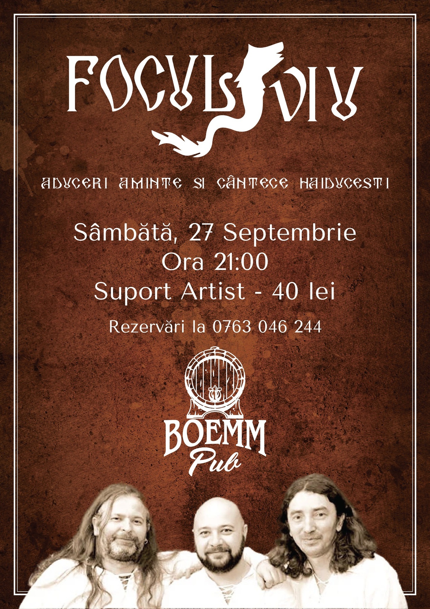 Sâmbătă, 27 septembrie 2025, de la ora 21:00, BoEmm Pub din Lugoj (str. Memorandului nr. 2C), găzduiește un nou concert al formației „Focul Viu”, una dintre trupele folk-rock cu peste două decenii de activitate pe scenele din România.