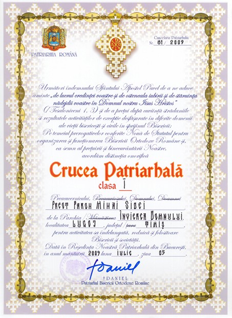 „După saisprezece ani de muncă de șantier (1993-2009) și slujire religioasă a parohiei am ajuns să trăiesc bucuria împlinirii. Răsplata a fost pe măsură. Preafericitul Părinte Patriarh DANIEL (bănățean din Lugoj), mi-a făcut cinstea să sfințească Biserica Învierea Domnului, înconjurat de patru Ierarhi, toți protopopii bănățeni și mulți preoți. A fost o zi istorică pentru Lugoj, în care până atunci nu a slujit niciodată un patriarh. Am fost răsplătit cu două daruri neașteptate dar foarte importante pentru viața mea preoțească: Preafericitul Părinte Patriarh a atribuit Bisericii Învierea Domnului și hramul Sfinții Mihai și Gavriil, zicând: „…pentru că Mihai a construit această biserică”. În cadrul Sfintei Liturghii mi-a atribuit cea mai înaltă distincție pentru preoți „Crucea Patriarhală””, spune cu bucurie pr. Sidei.
