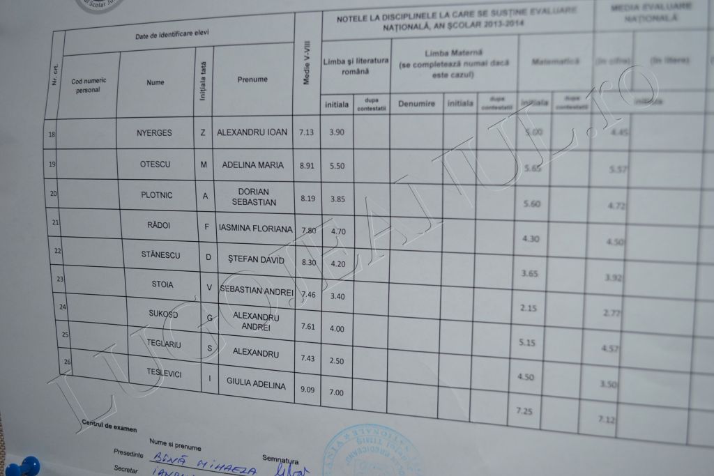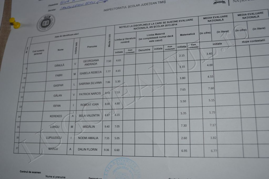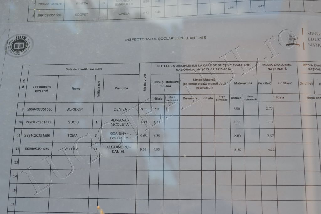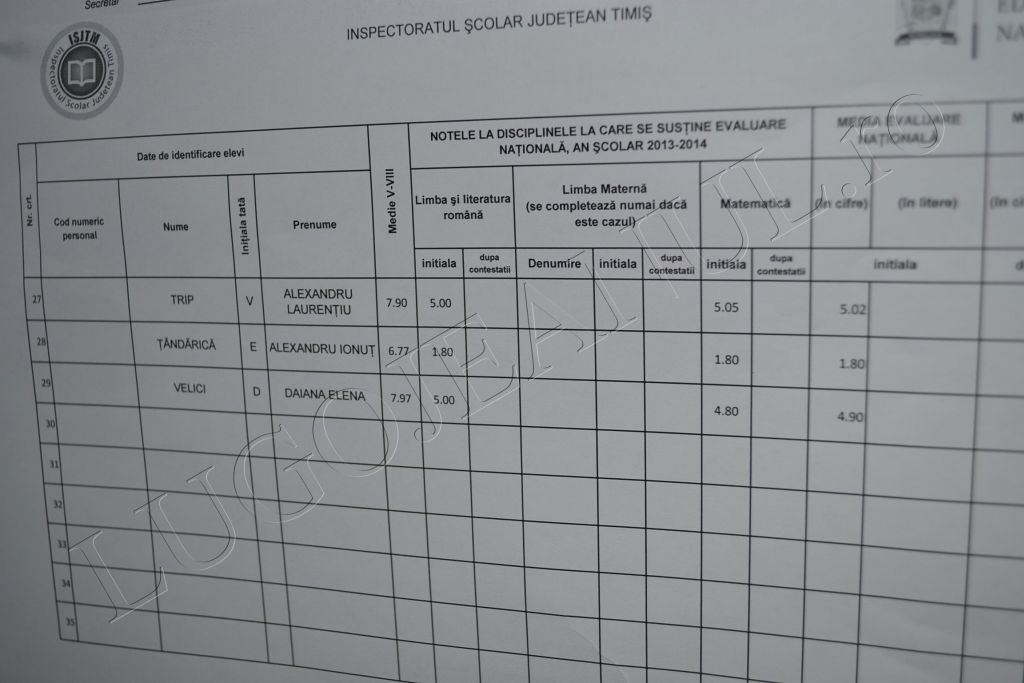 UPDATE 2: Potrivit datelor din cele două centre de examinare, Brediceanu și Hasdeu, la nivel de oraș la Limba Română sunt 0 note de 10, iar la Matematică, 4 note de 10, față de statistica din întreg județul Timiș, acolo unde la Limba Română sunt 7 note de 10 și 85 la Matematică. 92 de elevi lugojeni și din satele din jur care au susținut proba în cele două centre au obținut note sub 5 la Limba Română și 94 la Matematică. De asemenea, 8 copii au avut note dezastruoase la Română, obținând note între 1 și 1,99, iar alți 9 elevi au primit aceste note la Matematică.