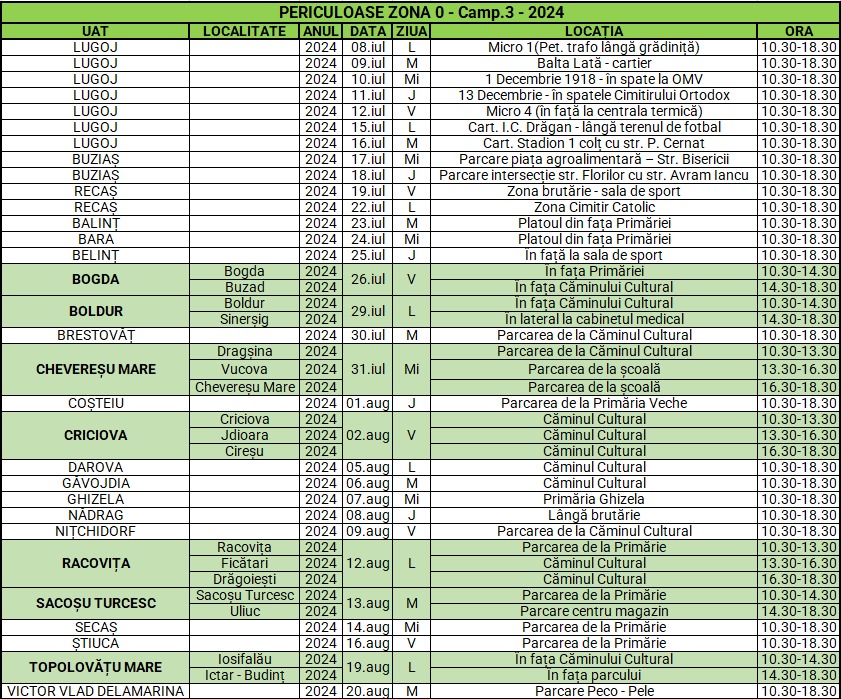 În perioada 08 iulie – 20 august 2024 se desfăşoară o campanie dedicată colectării deșeurilor periculoase din menajer în Zona 0 Ghizela a judeţului Timiş. Sunt incluse localitățile Lugoj, Buziaș, Recaș, Balinț, Bara, Belinț, Bogda (și în Buzad), Boldur (și în Sinerșig), Brestovăț, Chevereșu Mare (și în Dragșina și Vucova), Coșteiu, Criciova (și în Jdioara și Cireșu), Darova, Găvojdia, Ghizela, Nădrag, Nițchidorf, Racovița (și în Ficătari și Drăgoiești), Sacoșu Turcesc (și în Uliuc), Secaș, Știuca, Topolovățu Mare (Iosifalău și Ictar – Budinț) și Victor Vlad Delamarina.