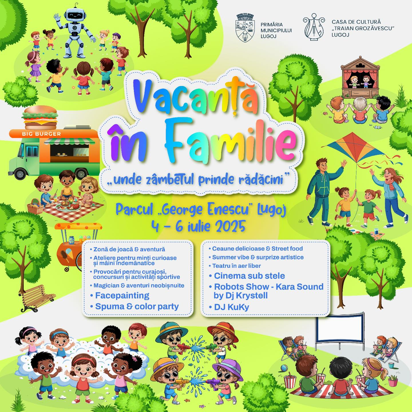 Casa de Cultură „Traian Grozăvescu” din Lugoj, în parteneriat cu Primăria Municipiului Lugoj, organizează în perioada 4–6 iulie 2025 evenimentul „Vacanță în Familie – unde zâmbetul prinde rădăcini”, o continuare a atmosferei create la „Sărbătoarea Copiilor”.