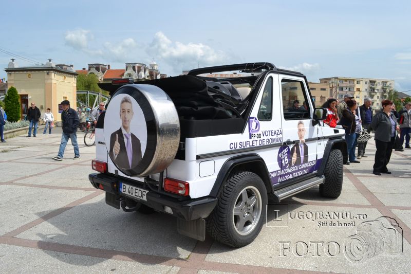 Alături de Diaconescu au fost și cei din staff-ul de campanie, cum sunt Simona Man, Florin Condurățeanu sau Liliana Mincă. De asemenea, pentru ca totul să fie în spiritul PPDD-ist, la miting a participat și Ioan Iovescu, senator, care a venit în mașina sa celebră, cu renumitul con violet deasupra, mașină care l-a ajutat pe fostul șofer de maxi-taxi să ajungă în Parlament. Diaconescu a venit la Lugoj într-o mașină de teren decapotabilă și decorată cu însemnele partidului, denumită „ddmobilul”.Dan Diaconescu a fost prezent ultima oară la Lugoj cu ocazia campaniei electorale pentru fotoliul de la Cotroceni, atunci când, în fața unei audiențe și mai numeroase, și-a expus planurile pentru un posibil viitor mandat de președinte. Din păcate pentru omul politic, această dorință nu s-a și materializat, astfel că mogulul nu mai are altceva de făcut acum decât să își susțină candidații din partid pentru posturile de deputați în Parlamentul European.