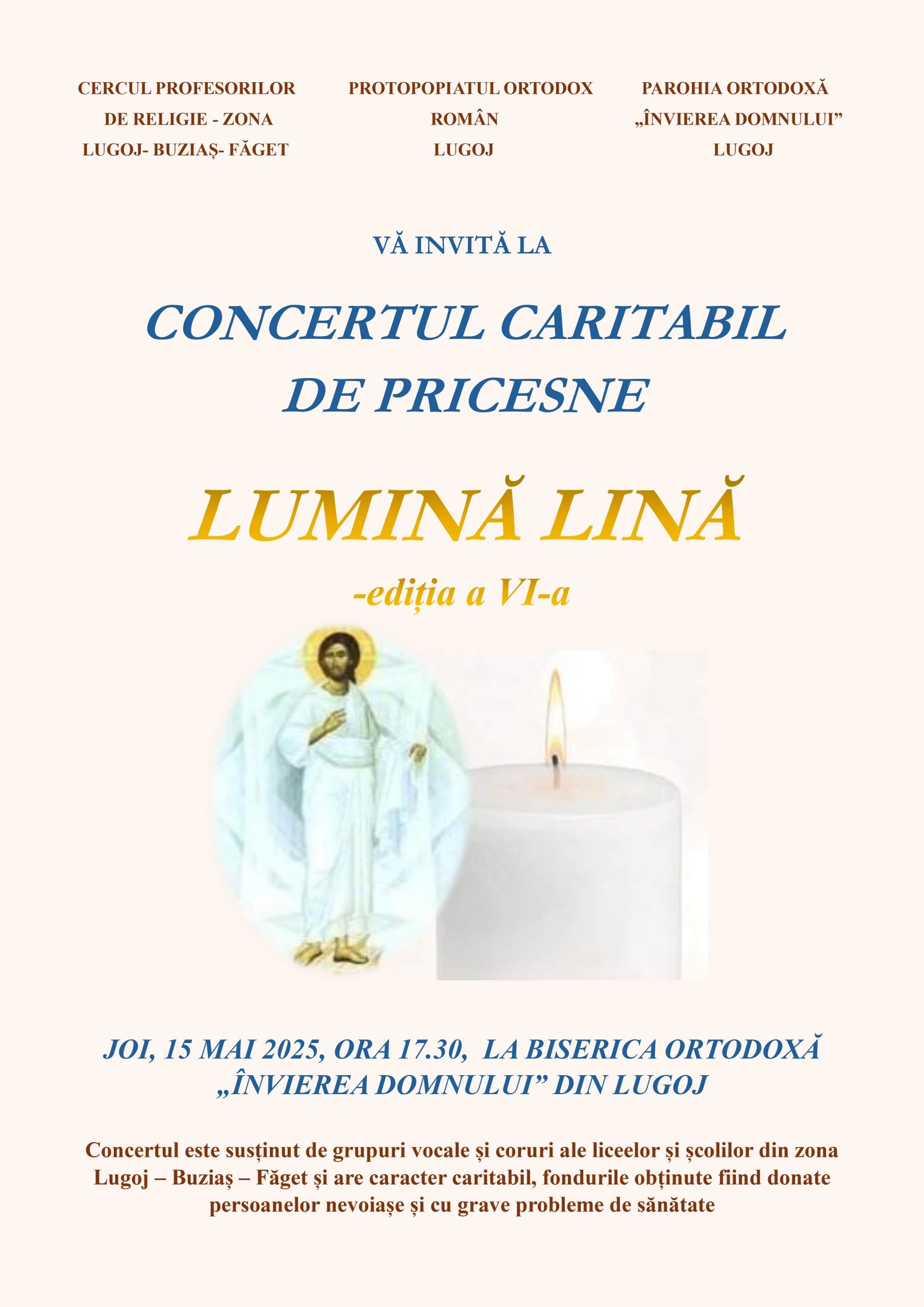 Joi, 15 mai 2025, de la ora 17:30, la Biserica Ortodoxă „Învierea Domnului” din Lugoj va avea loc ediția a VI-a a concertului caritabil de pricesne „Lumină lină”.