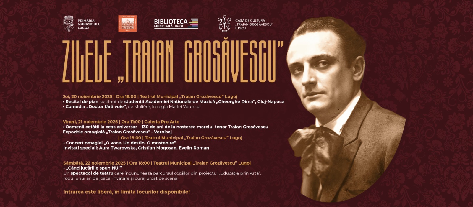 Primăria Municipiului Lugoj, prin Casa de Cultură „Traian Grozăvescu”, în parteneriat cu Muzeul de Istorie, Etnografie și Artă Plastică și Biblioteca Municipală Lugoj, organizează, în perioada 20–22 noiembrie 2025, evenimentul „Zilele Traian Grosăvescu”, dedicat marcării a 130 de ani de la nașterea marelui tenor lugojean.